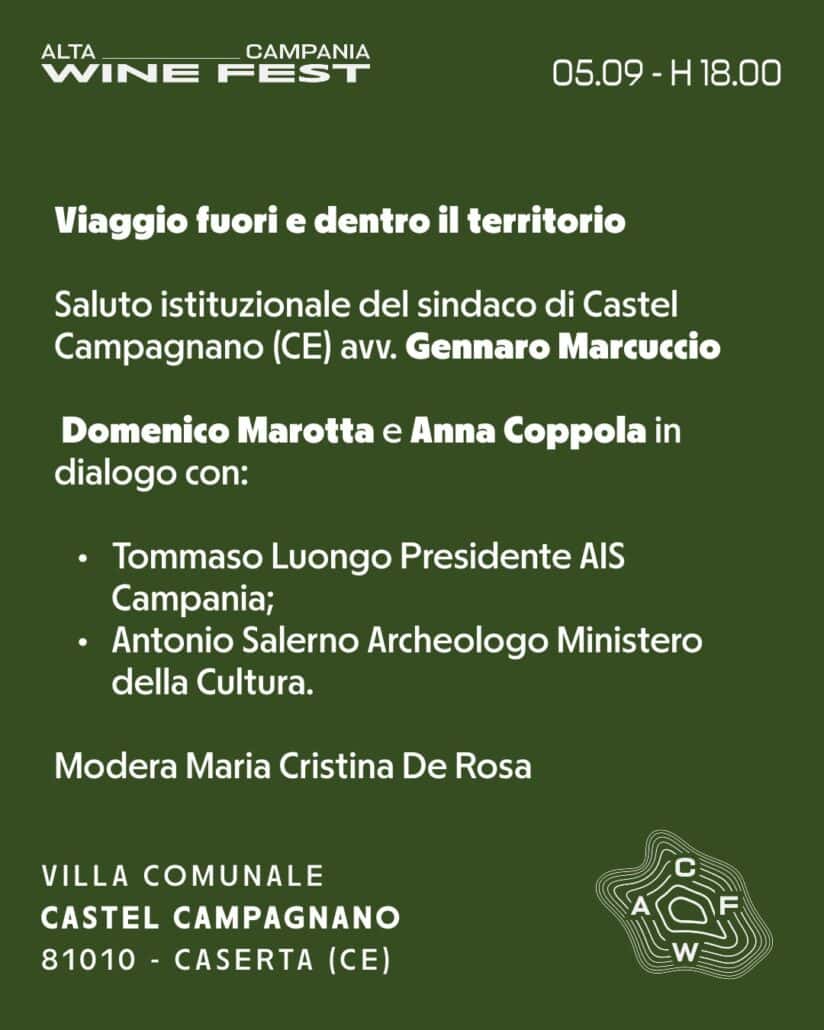 Si inizierà il 5 settembre alle 18 con un interessante talk con lo chef Domenico Marotta, chef 1 stella Michelin del ristorante “Marotta” di Castel Campagnano, assieme a Tommaso Luongo, sommelier presidente di AIS Campania, e ad Antonio Salerno, archeologo del Ministero della Cultura. Si proseguirà con la masterclass “I vini degli 8 borghi, 3 areali a confronto” con Giovanni Piccirillo che introdurrà il