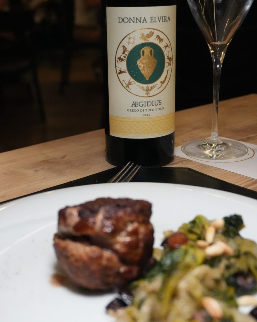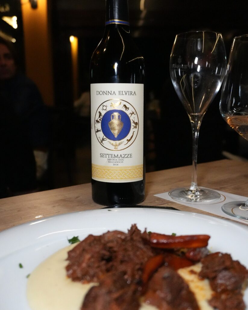 La prima portata è stata rappresentata da una sublime esecuzione di un piatto storico della casa: il Ròcher di Marchigiana Igp con Scarola Ripassata con Uvetta Passa e Pinoli, abbinato con l’Aegidius Greco di Tufo Docg 2021. Il piatto forte della serata, studiato appositamente dalla signora Concetta, è stato lo Spezzatino di Manzo Stracotto al Settemazze con Pepe di Sichuan, su purea di patate, accompagnato con cipolla caramellata. Un piatto così buono che è stato apprezzatissimo per la scioglievole intensità delle carni e dell’aromaticità calibrata, frutto anche di una marinatura di circa 24 ore proprio con lo stesso vino in abbinamento: il Settemazze Aglianico Doc Irpinia 2018.