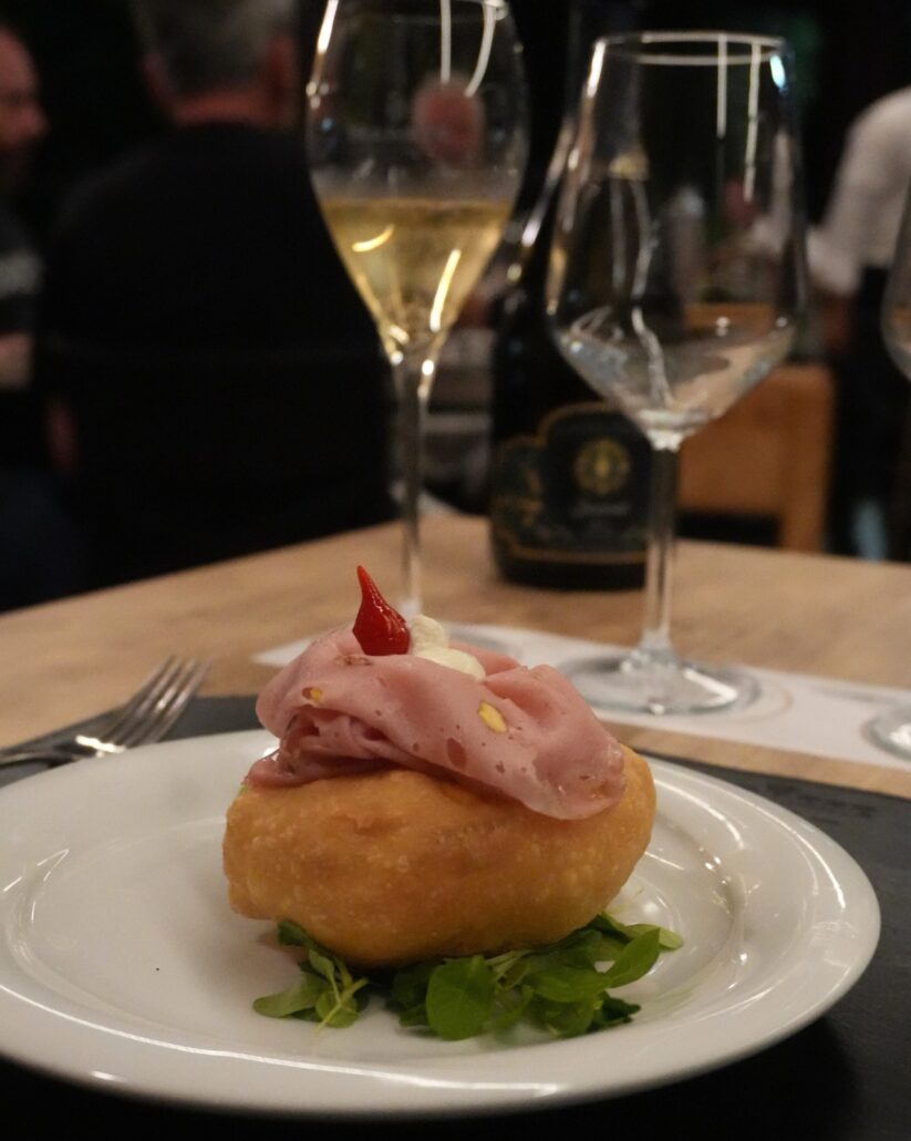 L’entrée di benvenuto ha visto la Montanarina con Mortadella e Ricotta di Montella abbinata alla spumante di Falanghina Irpinia Doc Brut Millesimato del 2021, una pizza fritta, golosa con buona croccantezza, sormontato dal salume home made e le sue profumazioni speziate ben diffuse dal calore della preparazione.