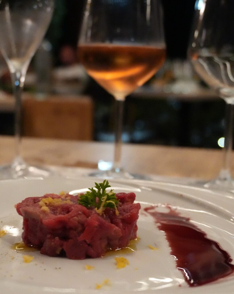 L’antipasto ha sorpreso gli ospiti, grazie ad un lavoro di mondatura delle carni e un gioco di equilibri che hanno costituito gli elementi principi per realizzare la Tartare di Manza Marchigiana Igp con Colatura di Alici, Aglio Orsino e Scorzette di Limone, abbinata stavolta all’Aglianico Irpinia Doc Brut che, come il precedente, è stato realizzato grazie al Metodo Charmat, un sapiente contatto sulle fecce fini e figlio della stessa annata.