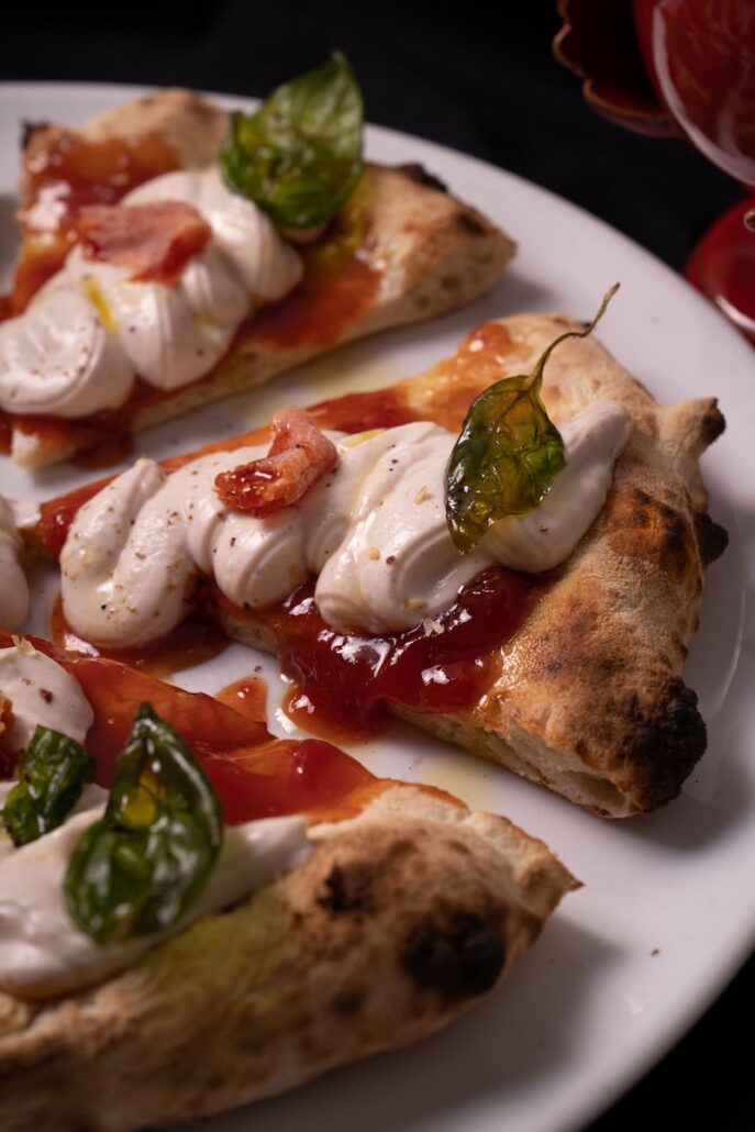 C’è poi la Sweet Margherita. Realizzata con crema di ricotta mantecata al limone, cannella, zucchero a velo, marmellata di pomodoro San Marzano, pomodoro candito, foglie di basilico fritto e olio extra vergine d’oliva.