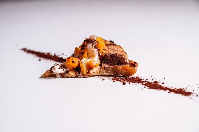 Chiude in bellezza la Sant’Arcangelo. Pizza che vede protagonisti una tartare di Percuoco di Sant’Arcangelo, scampi conditi con limone candito, tabasco, olio all’arancia e una grattugiata di fava di cacao.